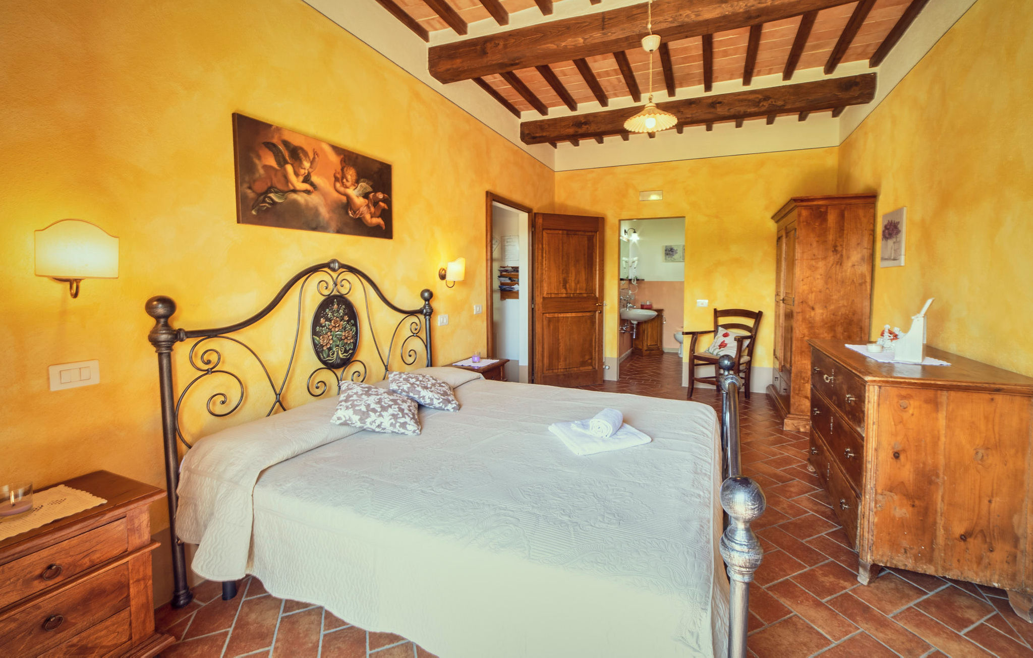 Cucina, ampio soggiorno con camino, due bagni, due camere matrimoniali, aria condizionata.